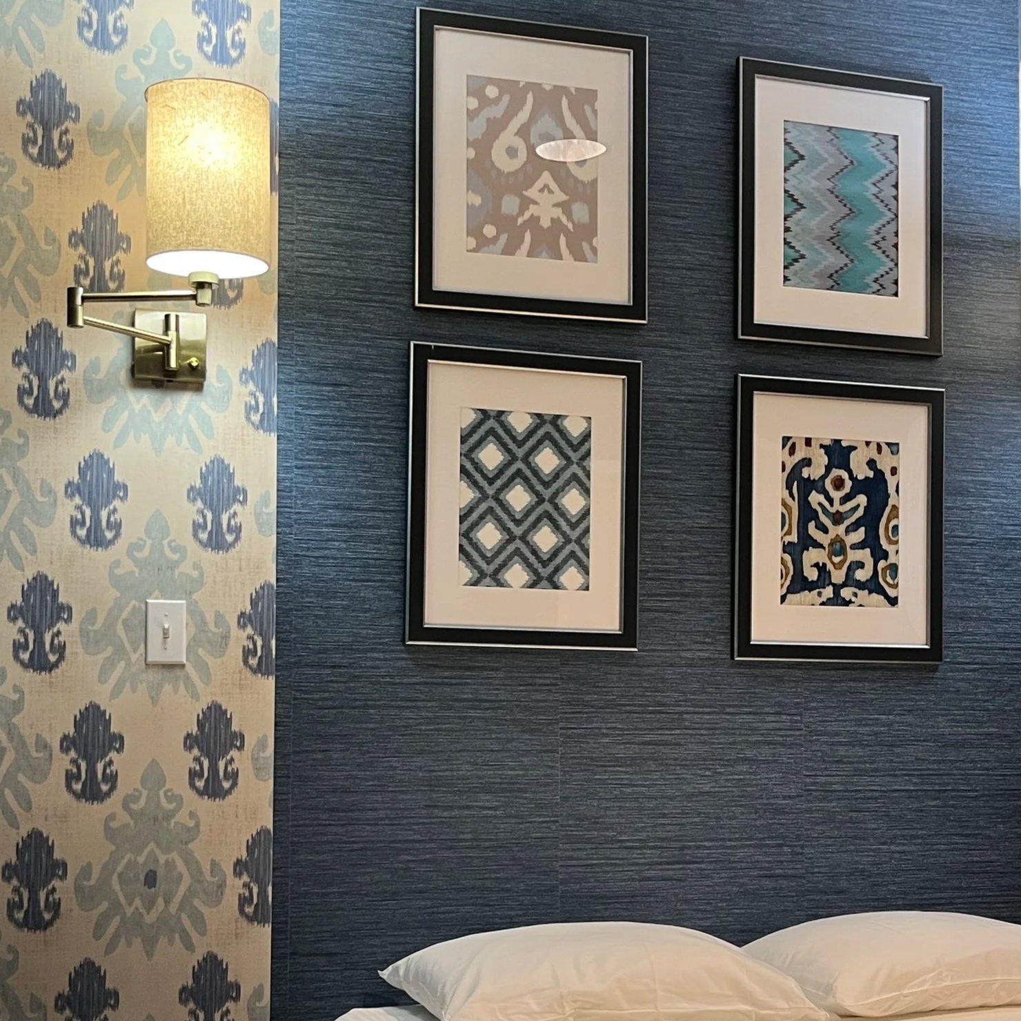Framed wallpaper swatches continue “Ikat” theme in sleep lab’s rooms.